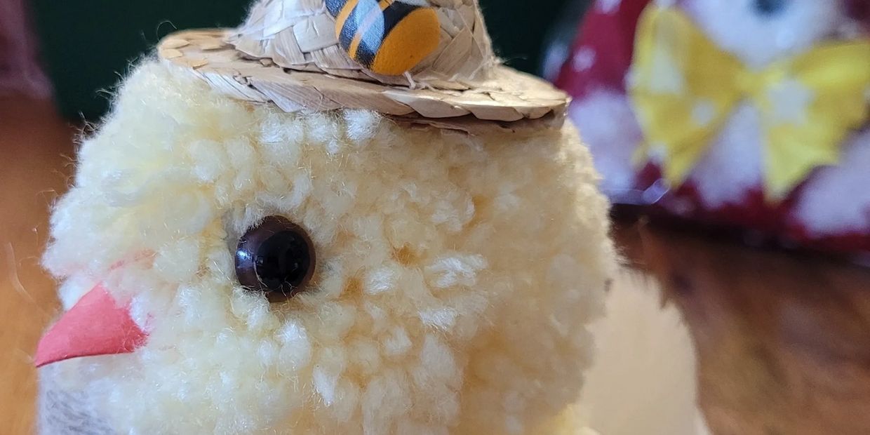 Few remaining handmade super cute wool easter chicks with straw hat and hessian bow.